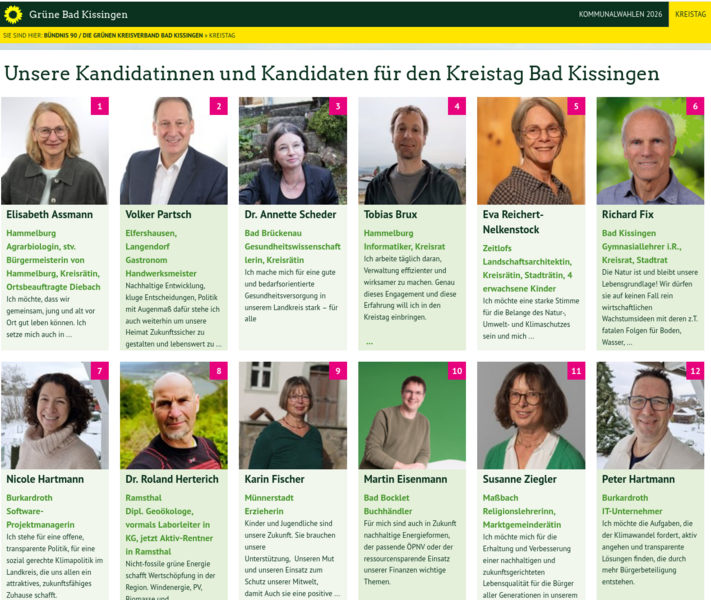 Die Vorstellung unserer Kandidatinnen und Kandidaten für die Kreistagswahl 2026 ist ab sofort online. Auf der Homepage geben wir einen umfassenden Einblick in die Menschen, die für Bündnis 90/Die Grünen im Landkreis antreten.